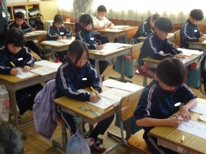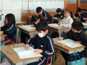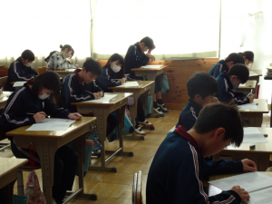 児童は、1年間の学びの確認テストに集中して取り組んでいました。