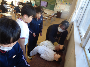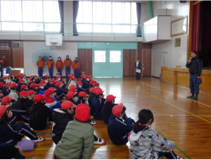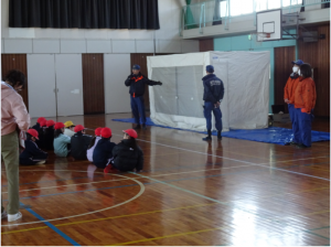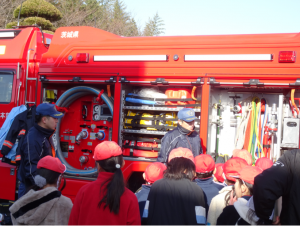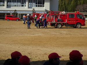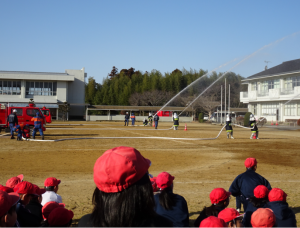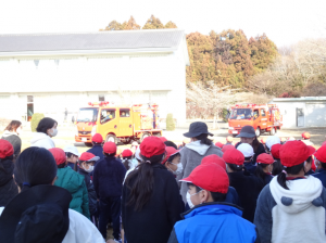 消防団の皆様による放水消火の様子を見学させていただいたり、消防車、救急車の設備を見学させていただいたりしました。また、煙体験や水消火器体験など、様々な体験学習を行い、災害が起こったとき、避難をするときに気を付けることについて教えていただきました。児童にとって、たいへん貴重な学びの機会となりました。