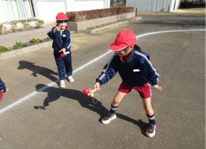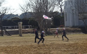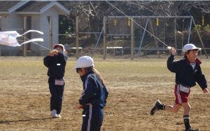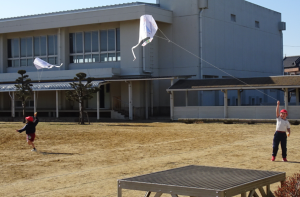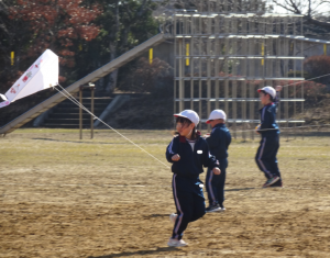 1年生が生活科の学習で「たこあげ」など、季節の遊びを体験しました。友達と協力しながら楽しく活動していました。