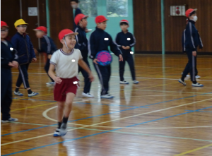 今日はロングの昼休みの時間に、3年生と4年生がドッヂビーを楽しみました。元気いっぱい活動していました。