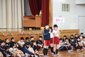 四年生が中心になって、五、六年生の陸上記録会の応援練習をしました。 |