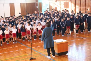 | 全校朝会で、表彰がありました。「ごみの散乱防止と3Rに関するポスターコンテスト」の優秀賞を受けた児童と校内ローマ字入力の基準を達成した児童が表彰されました。その後、全校で合唱を行いました。 |