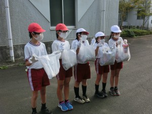 | 4年生が学校の周りのゴミ拾いをしました。環境をよくするためのウォークラリーです。子生弁天などを回り、たくさんのゴミを見つけてきました。ごみは、分別して処理しました。 |