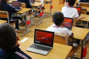 | 昨年度から,1人に1台のパソコンが使えるようになりました。自分専用のパソコンです。1年生もパスワードを入力して起動させることができました。これから,ロイロノートというワープロとプレゼンテーションソフトとスタジオが合わさったようなソフトを使って,楽しく学習していきます。 |