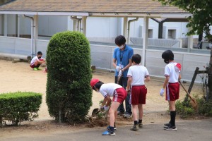 | 飼育栽培委員が,花壇の手入れをしました。サツキの植え替えです。サツキを抜いた後には,サルビアなどを植えました。 |