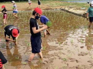| 今年も学校田を使って、田植えをしました。児童は、楽しく泥に親しみ、田植えをしました。ここに至るまで、準備に協力していただいた方々に感謝しつつ、すてきな体験ができたことを喜びたいと思います。 |