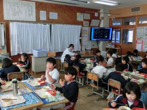 グループで楽しく給食を食べ、とても盛り上がっていました。やっぱり友達と食べるのは、楽しい時間ですね。みんなで食べるって楽しいね。