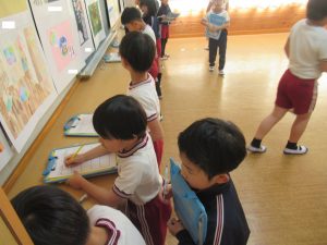 4時間目は、巡回子ども展を見ながら鑑賞をしました。作品のすばらしさや色の塗り方、工作の工夫を見ながら鑑賞していました。