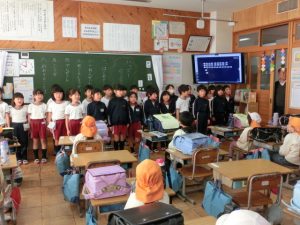保幼小連携の交流として、4月から入学する旭幼稚園・旭保育園の園児が学校探検に来校しました。初めて入る小学校内をいろいろと見て回りました。また、1年生教室では、「ハッピーにこにこかい」を準備して園児に1年生体験をしてもらいました。ランドセルを背負い、教科書を見たり、おしゃべりしたり、優しいお兄さん・お姉さんと交流しました。手作りのプレゼントをもらって、みんなにこにこ笑顔でした。4月から入学してくることが楽しみです。
