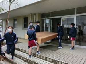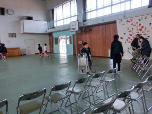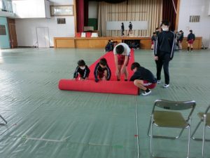 シートしき、テーブル・演台運び、そうじ、赤絨毯しきなど一人一人が役割分担されたことを一生懸命行いました。