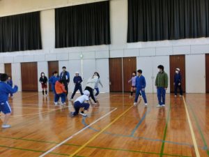 「陣取りゲーム」は、相手チームからのタッチをかわして相手の陣地を取るゲームです。攻める人、守る人など役割を決めながら楽しく体を動かすことができました。