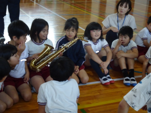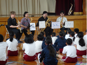 モデトロ・サクソフォン・アンサンブルの皆さんにご来校いただき、3時間目に1~3年生が、5時間目には4~6年生が、演奏鑑賞会を行いました。