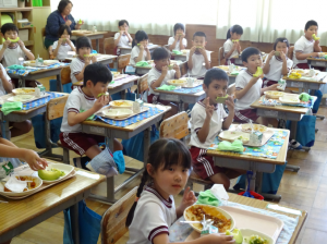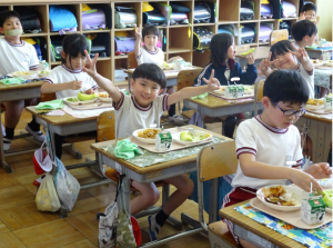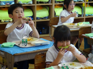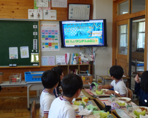 今日の給食には、鉾田市の特産物であるメロンが提供されました。このメロンは、JAほこた、JA茨城旭村より提供していただいたものです。児童は、給食センターから送付されたメロンに関する動画を見ながら、甘いメロンをとてもうれしそうに食べていました。おいしいメロンをごちそうさまでした。