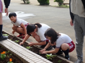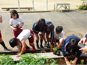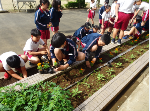 朝の時間を活用して、5年生が花壇の苗植えを行いました。