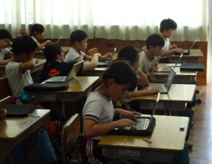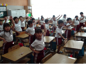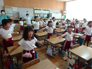 1年生は、ダンスの映像を見て、一緒に踊りながら振り付けを覚えていました。楽しそうです。