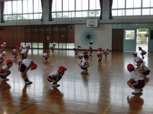 1年生は体育で「準備体操」をしていました。体育係を中心に号令をかけて元気に行っていました。