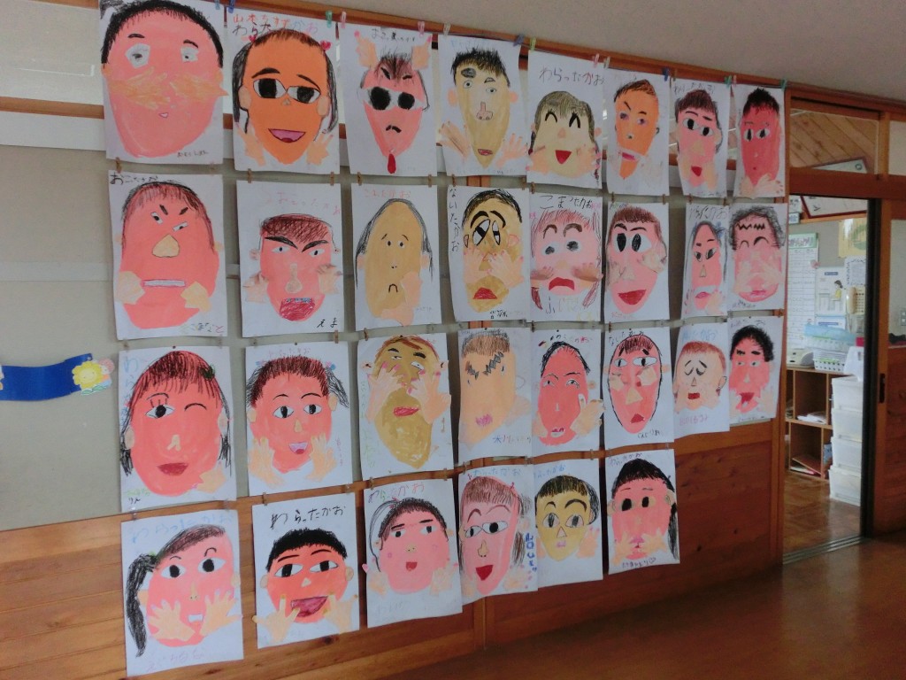 1年生廊下の壁に,素晴らしい作品が展示されています。見ていてあったかい気持ちになり、自然と笑顔になります。笑った顔や泣いた顔、困った顔・・たくさんの顔があります。一人一人自分の特徴がでていて,力作です。