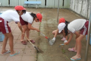 五、六年生がプールの中、四年生がプールの周辺をきれいにしました。楽しいプールの学習が、もうすぐ始まります。