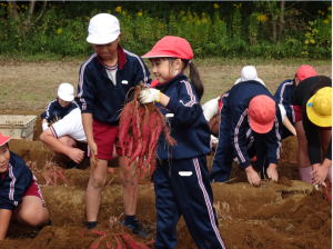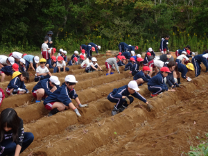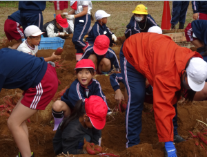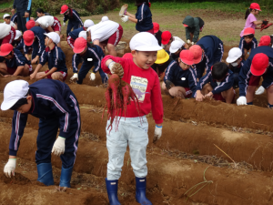 縦割り班でさつまいもほりをしました。農家の保護者の方に、畑の整備からマルチはり等、様々な面でご協力いただき、今日は、たくさんのサツマイモが収穫できました。子供たちは、掘り出したさつまいもを見て、大喜びでした。