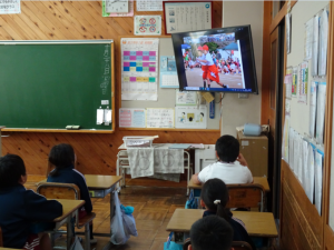 各学級では、ダンスを思い出して音楽に合わせて体を動かすなど、スライド発表を楽しむ様子が見られました。