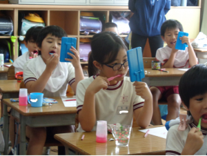2年生が学級活動の時間に養護教諭による「歯磨き指導」を行いました。磨き残しがないか鏡を使って自分で確認しながら、きれいに歯を磨くポイントについて学習していました。