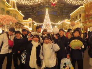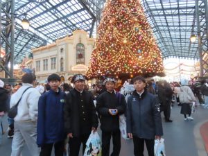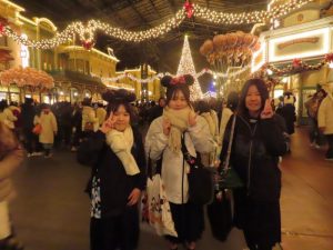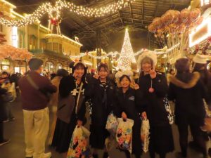 みんなお土産を買い、きれいなクリスマスのイルミネーションを背景に写真を撮りました。