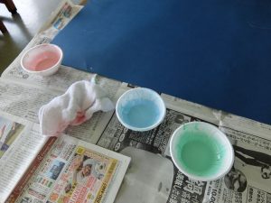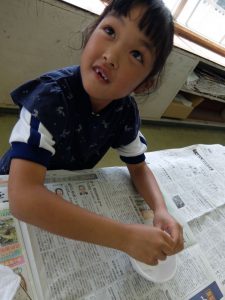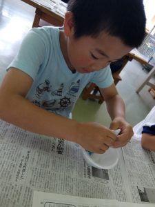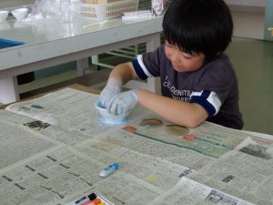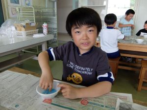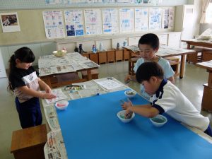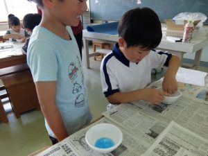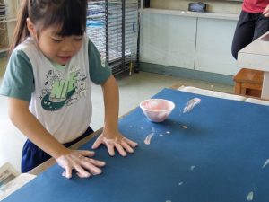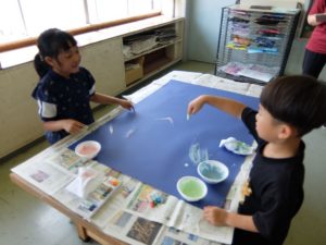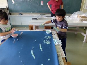 1年生が、不思議な感触の絵の具を使っていました。