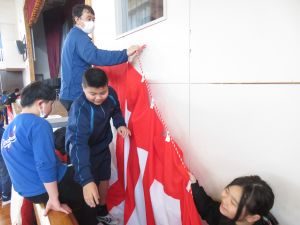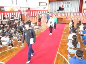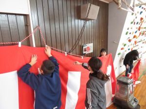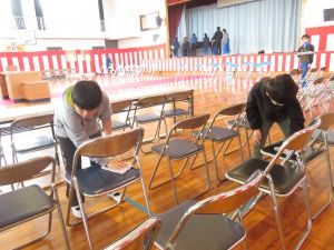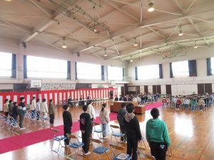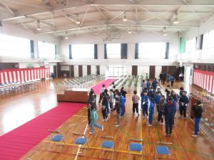 今日の3、4時間目に4、5年生が卒業式の式場作成を行いました。 フロア掃除から、椅子並べ、椅子や机拭き、紅白幕の設置、赤じゅうたん敷き等、一人一人が仕事を見付けて、6年生のために素晴らしい式場を完成させました。4、5年生ありがとうございました(*^▽^*)