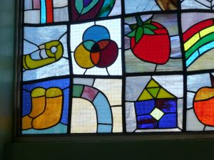 4 これは実は難しかったんじゃないかな? これは何と呼べばいいでしょうか。ステンドグラスというのかな。階段のところにあるよね。ちなみに,アップにした部分は,一番下の左から2番目のガラスの,青とか紫になっていない,うす黄色っぽい部分です。なかなかハイレベルな問題でしたかね。