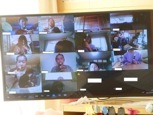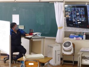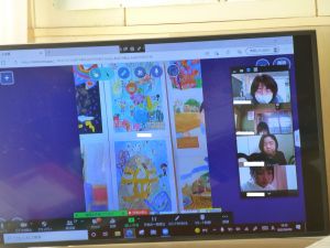 担任の先生が実際にリコーダーを吹いたり,画面を通してリコーダーや鍵盤ハーモニカを練習する児童の姿が見られます。4年生教室のモニターには図工の作品が表示されていました。