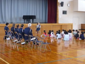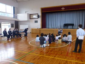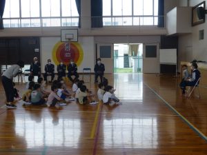①1~3年生を対象に交通安全教室を行いました。今年は、全児童に関係のある安全な道路の歩行に焦点を絞って指導をいただきました。写真は、1年生を対象に腹話術を活用して指導をしてくださっているところです。