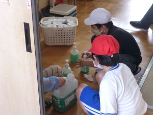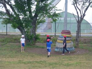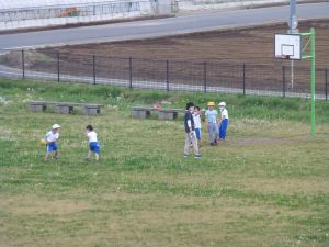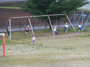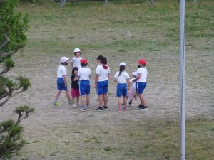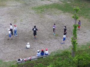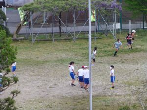 ②今日はわんぱくタイムです。屋上から校庭の様子を眺めてみました。校庭の各所で楽しく遊びまわる様子が見られました。