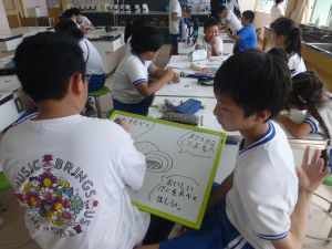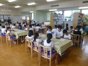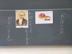 3校時は全校道徳。あんぱんを開発した木村安兵衛・栄三郎が「美味しいあんぱんをみなさんに食べてもらいたい」という強い意志を貫いて、たくさんの苦労を乗り越えて成功したという教材文をもとに授業が行われました。