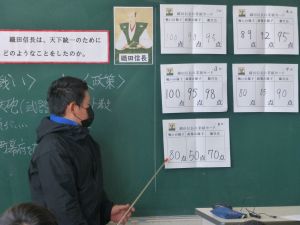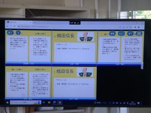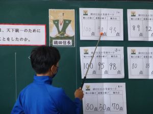 10/6 社会科授業研究(6年)今日は、6年社会科の授業研究を行いました。日本を代表する戦国武将の1人・織田信長に着目し、彼の戦や政策について児童が点数をつけ、そしてその理由づけの中から織田信長の業績等について拾い上げ、まとめていました。6年社会科の授業中では、端末が普段使いされており、子どもたちは慣れた様子で学習を進めていました。また、グループ活動でも、信長の評価について活発に話し合い、その理由を各班が教科書等の資料をもとに拾い集めていました。