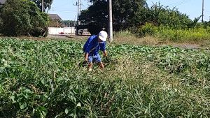 久しぶりに畑に着いた児童は、緑で覆われた面積のあまりの広さにびっくり。子どもたち、そして同校した職員は一生懸命働いたのですが、思った以上に広く、まだまだ終わらないという状況です。