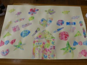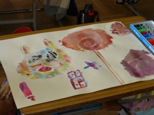 3年教室では絵を描いていました。水をたくさん使って、淡い色彩で、カラフルできれいな作品が仕上がりつつあります。とってもきれいでした。