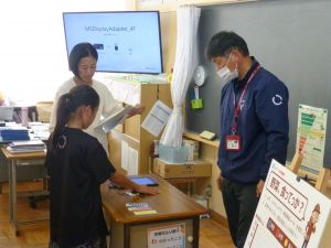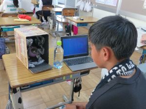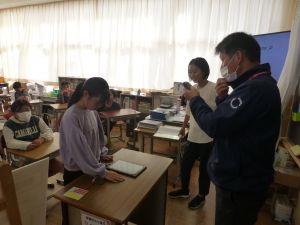 5年教室には、市のまちづくり推進課からお客様をお迎えして、「べジチェック」を行いました。これは、LED(発光ダイオード)を搭載したセンサーに手のひらを押し当てて、約30秒で、野菜摂取量を推定できる機器です。 皮膚に蓄積したカロテノイド量を測定して、タブレット画面に推定野菜摂取量を表示します。結果はよかったとは言えませんが、こういった機会が野菜をちゃんと食べようと考えるきっかけになればと思います。鉾田市は、トマトジュースで有名なカゴメさんと提携しており、後日カゴメさんからお客様を迎えて、出前授業を行っていただく予定です。どんなお話になるのでしょうか。お楽しみに。