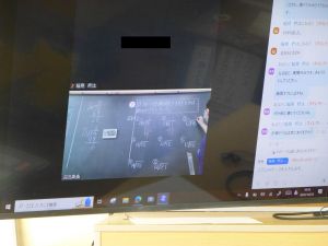 欠席者がオンラインで授業に参加している様子です。ビデオ・オンになっていないため、顔は写っていませんが、画面を通して欠席者が家庭から授業に参加しているところです。