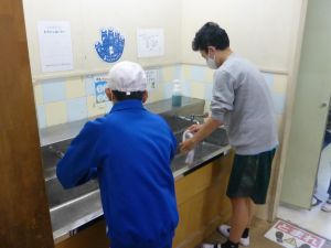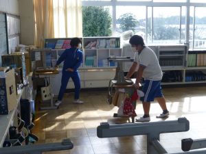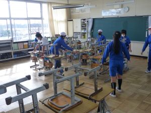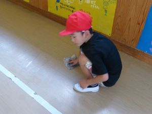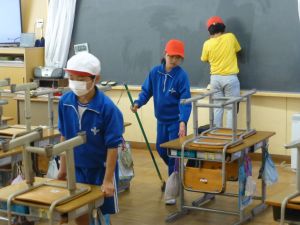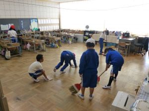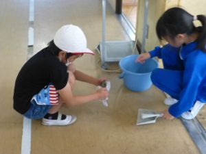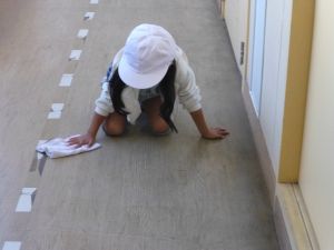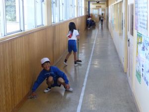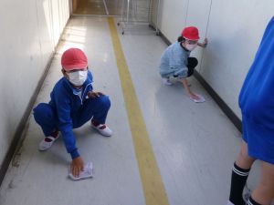 清掃は、とりあえず今週は縦割り班ではなく、学年単位で行っています。学年間の必要以上の交流を控えて、感染防止につなげたいためです。そんな中、廊下や教室の雑巾がけなど、一生懸命掃除に取り組む姿が見られました。