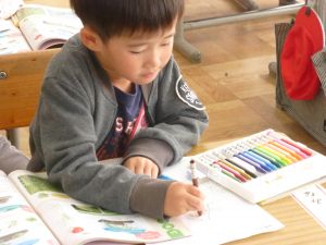 10/24 1年生教室にて4校時は生活科。こん虫の勉強です。今日は教科書の内容をじっくりと読んでワークシートにまとめていました。バッタやトンボの図にはカラフルに着色していました。
