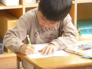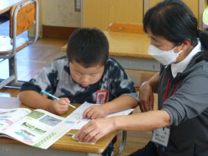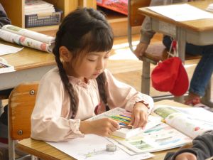 4校時は生活科。こん虫の勉強です。今日は教科書の内容をじっくりと読んでワークシートにまとめていました。バッタやトンボの図にはカラフルに着色していました。
