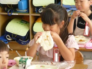 今日の給食はキーマカレーとナン。タンドリーチキンもおいしかったです。