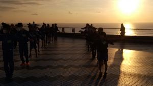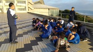 朝のつどいがありました。まだ眠そうでしたが、朝日がきれいでした。この後、朝食です。