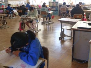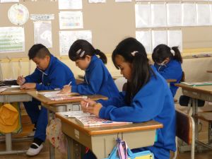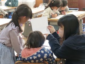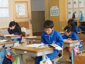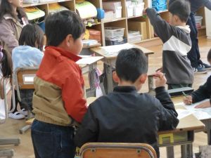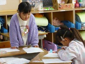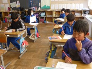 1年生国語のグループ学習の様子です。グループの友達と相談しながら学習を進めています。