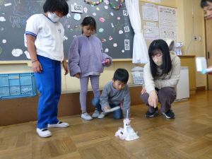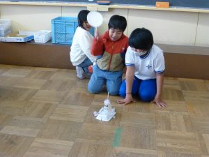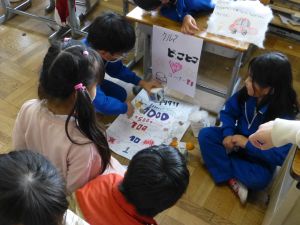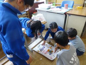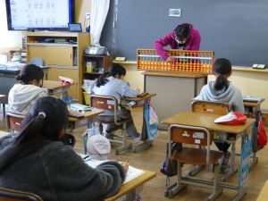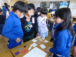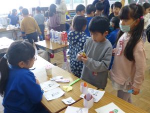 5校時は、おもちゃランドの時間です。これは、生活科の授業の中で2年生がおもちゃを制作し、1年生を教室に招いて遊んでもらう企画です。ここまでの準備の期間、2年生は、1年生に楽しんでもらうことを念頭に置いて、おもちゃづくりを進めてきました。今日のおもちゃランドでは、それぞれのおもちゃを1年生に紹介しつつ、遊び方を教えたり、できたことを褒めたり、用意した景品を渡したりと、お兄さんお姉さんとして活躍する姿が見られました。1年生のみなさんも、この機会を楽しむことができたようです。