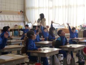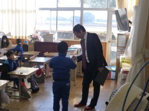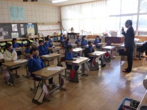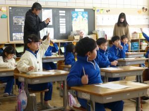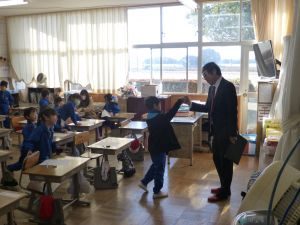 同じく1時間目、1年教室ではスクールカウンセラーさんの授業が行われていました。エンカウンターという授業で、主にビンゴなどのゲームを行いながら、学級のあたたかな人間関係づくりを一層推進することを目指して行われるものです。子どもたちは、ビンゴになるたびに「やったー」と喜びながら活動していました。