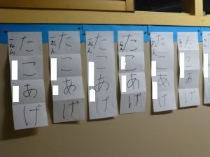 今週、各学年で書き初めを行う予定となっており、今日は早速1年生が書き初めに取り組んでいました。写真は、廊下に掲示された作品の一部です。明日以降、1年生以外の学年でも順次実施予定です。