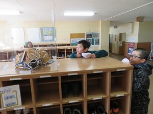 1/18 本校にもついに・・・!昨年末から話題になっていた大谷翔平選手のグローブが届きました! まず、今日・明日の2日間は昇降口に展示することとし、来週からは児童が触ったり、実際に使ったりできるようにできるように計画を進めていきます。 本日、中休みの時間にあわせて昇降口に展示したところ、子どもたちは大喜びでグローブのまわりに集まり、野球をよく知らない子たちも興味津々にグローブを眺める姿が見られました。さすが大谷選手、大人気です。