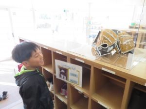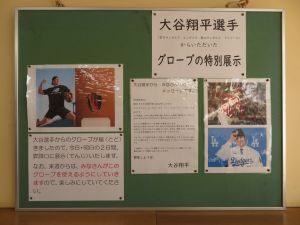 本日、中休みの時間にあわせて昇降口に展示したところ、子どもたちは大喜びでグローブのまわりに集まり、野球をよく知らない子たちも興味津々にグローブを眺める姿が見られました。さすが大谷選手、大人気です。