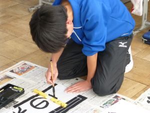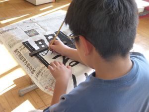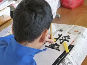 子どもたちは、普段は使うことのない書き初め用紙に、真剣な表情で向き合っていました。